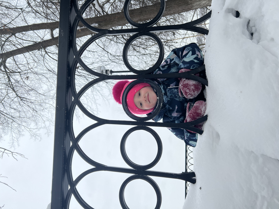 A young child with rosy cheeks and a pink winter hat peers through a circular opening in a black wrought iron fence. The child wears a patterned winter coat and pink mittens. The fence is partially obscured by a mound of fresh snow. Bare trees are visible in the background against a gray sky. The photo is oriented vertically, with the fence appearing to be on its side.