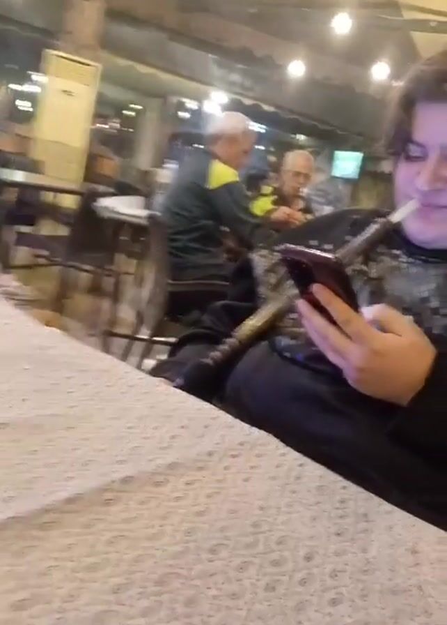 person sitting at a table in what appears to be an indoor restaurant or cafe. The person is holding a smartphone in their right hand and using it while also holding a hookah hose in their mouth. A white coffee cup is on the table next to them. In the background, there are other patrons seated at tables. There's an older man wearing a green jacket and an older man wearing glasses sitting in the background. The interior of the establishment features tables, chairs, lighting fixtures, and what appears to be an air conditioning unit.