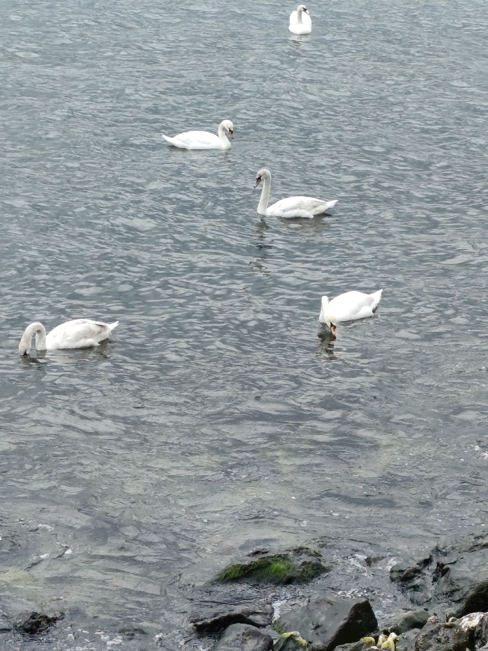 The image displays a waterfront scene in Varna, Bulgaria, likely along the Black Sea or Varna Lake. Five swans are observed on the subtly rippled, grey-blue water. One white adult swan is positioned in the upper background, facing away. In the mid-ground, a white adult swan swims towards the right, while a greyish-white juvenile swan faces left. In the lower-left quadrant, a second greyish-white juvenile swan has its head submerged below the water's surface, indicative of feeding. A fifth white adult swan, located in the lower-right, also has its head submerged. The immediate foreground reveals a rocky shoreline with dark grey stones, several of which are partially covered by green algae or moss. The ambient light suggests an overcast sky.