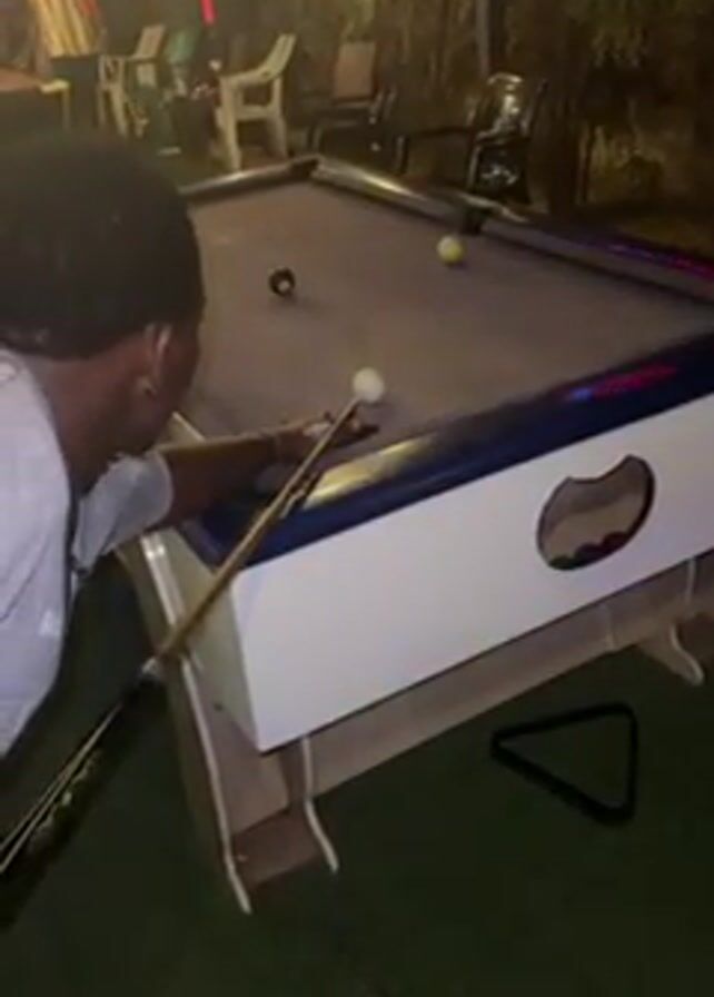 A person plays pool outdoors at night. The person lines up a shot with a pool cue. The pool table has a white body and blue trim. There is a black 8-ball on the table. The person hits the cue ball. The person walks away after taking the shot. There are chairs and greenery visible in the background. The scene is dimly lit.
