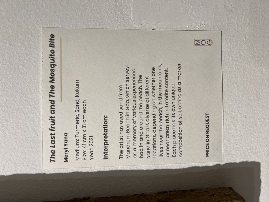 white wall with a white rectangular sign on it. The sign contains information about a piece of art titled "The Last fruit and The Mosquito Bite" by artist Meryl Yana. The art piece is made of turmeric, sand, and kokum, and measures 41 cm x 31 cm. The year of creation is 2021. The description of the piece states that the artist used sand from Mandrem Beach in Goa, which serves as a memory of various experiences had in and around the beach. The sand in Goa is diverse at different locations, depending on whether one lives near the beach, in the mountains, or near areas rich in laterite content. Each place has its own unique composition of soil, acting as a marker. The sign includes the phrase "Price on Request" and a small logo that reads "MOG". The coordinates provided (latitude: 15.521, longitude: 73.791) are not relevant to the image, as they point to a location in the city of Marra, India.