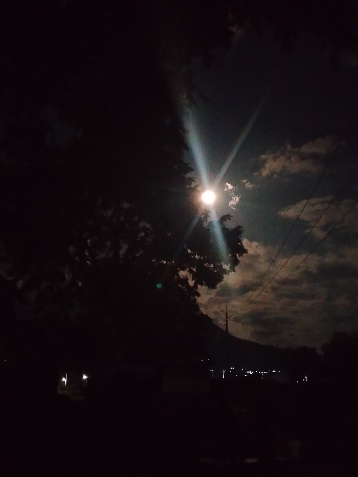 The image displays a nighttime scene in Adankolo, Nigeria. The sky is dark, with scattered clouds partially illuminated by a prominent, bright circular light source, identified as the moon, positioned slightly left of center. Distinct lens flares emanate from the moon, extending diagonally. A large, dark silhouette of a tree with visible foliage occupies the left side of the frame and extends into the upper left, partially obscuring the sky. In the midground on the right, a dark, elevated landmass, consistent with a hill or mountain, is visible. A slender, vertical structure, resembling a communication tower or utility pole, stands against the sky on its slope. Below this landmass, numerous small, bright artificial lights are discernible in the distance, suggesting urban infrastructure. Multiple dark, thin utility lines traverse the upper-right portion of the sky. No individuals, specific actions, or direct interactions are visible.