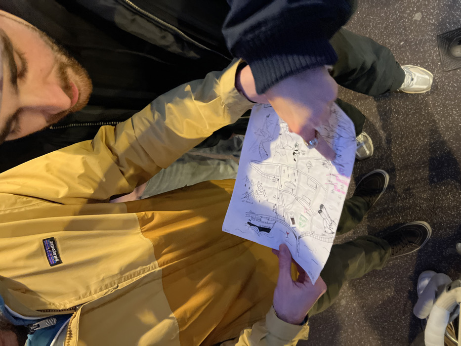 An overhead shot shows three people looking at a hand-drawn map. The map includes illustrations of buildings, landmarks, and a waterfront. One person points to a section highlighted in pink on the map. A person wears a yellow and brown Patagonia jacket while another is clad in a dark jacket. Various footwear is visible, including white sneakers and dark-colored sneakers, indicating they are standing on an urban surface.