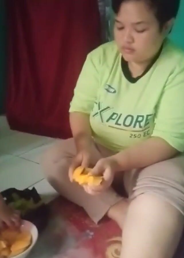 A woman and a child sit on the floor, likely in a domestic setting. The woman, wearing a light green shirt with the word “EXPLORE” on it, is cutting a piece of fruit, possibly mango, with a knife. She sits cross-legged on a cushion, with a bowl full of fruit beside her. The child, wearing overalls, is reaching into the bowl and taking pieces of the fruit. The floor is tiled and there is a red curtain in the background. There are other objects and clutter on the floor as well, but they are mostly out of focus. The camera angle is slightly above, looking down on the scene.