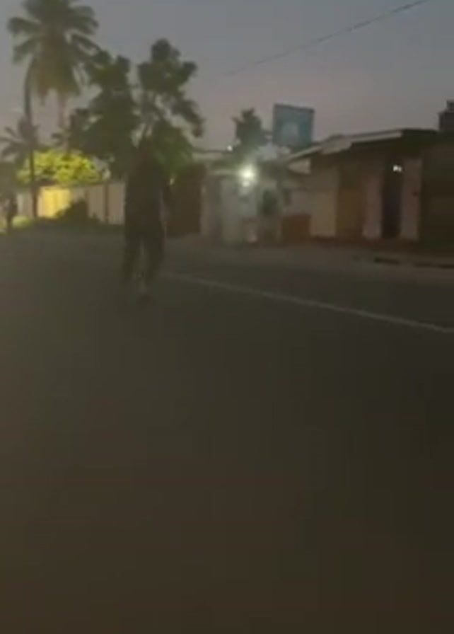 A person is rollerblading down a street in what appears to be a residential area. It is early morning or late evening, as the sky is dusky. The person is wearing dark clothing and white rollerblades. They are skating on the right side of the road. There are buildings and trees on either side of the road.