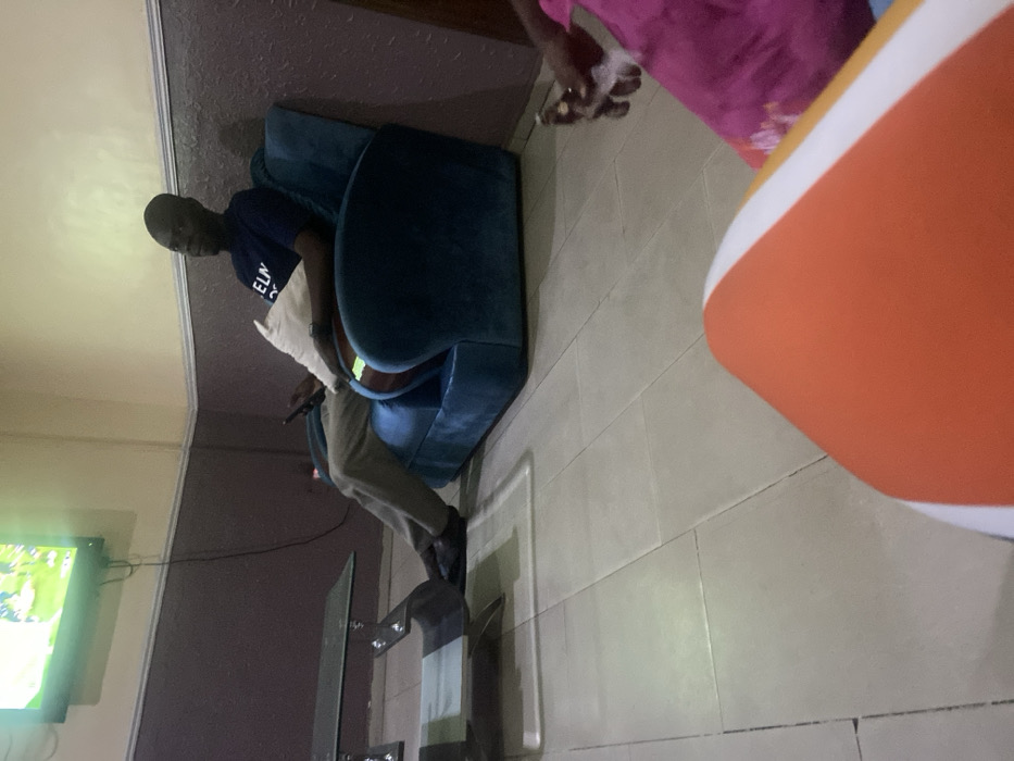 An indoor scene in Yenegoa, Nigeria, depicts a room with two-toned walls, featuring a darker lower section and a lighter upper section, separated by a molding. The floor is covered with light-colored tiles. A wall-mounted flat-screen television displaying a blurred image with green elements is visible in the upper left. An adult male is seated on a teal-blue single-seater sofa, oriented towards the right but looking directly at the camera. He wears a dark blue t-shirt with white text, light-colored trousers, and dark sandals. He holds a dark smartphone in his left hand, and a white cushion is positioned behind his back. In the foreground, to the lower right, the legs of another individual are partially visible, clad in bright pink fabric. A hand from this individual, holding a small white object, is also present in the frame. A glass-top coffee table with dark metal legs is situated in the mid-ground, to the left of the male subject. An orange and white object, likely part of a chair or leg of the foreground individual, occupies the immediate lower foreground.