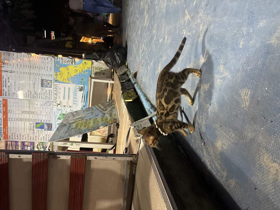 The image depicts a nighttime scene at a speed boat service area in Ban Ko Li Pe, Thailand. In the foreground, a small, short-haired domestic cat with a brown and black spotted (rosetted) coat, indicative of a Bengal, is walking from left to right across a textured blue surface, likely a boat deck or pier. The cat is wearing a white necklace composed of shells or beads around its neck. Its head is slightly turned towards the left, and its front left paw is raised mid-stride. To the left, a portion of a wooden structure with horizontal red slats and white vertical supports is visible. In the mid-ground and background, a large white signboard displays "SPEED BOAT SERVICE" information, including routes, departure/arrival times, and prices for destinations such as Koh Lipe, Had Yai City, Koh Lanta, Krabi, and Phuket. Below this timetable, maps, including one labeled "LANGKAWI FERRY," are visible. A white wooden bench is situated beneath the main signboard. A black plastic trash bag rests on the ground near the base of the signboard. Several blurred human figures are visible walking in the background on the right, wearing casual attire. The scene is illuminated by artificial light sources, casting shadows and highlighting the immediate environment.