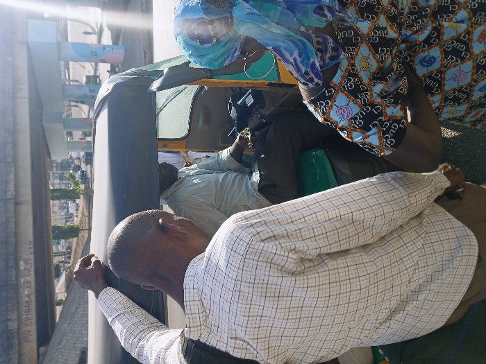 The scene depicts an urban setting under a concrete overpass in Kwekwe, Zimbabwe. In the foreground, three individuals are positioned around a three-wheeled motorized rickshaw, commonly known as a tuk-tuk. A bald man, viewed from the back, wears a white and dark-checked long-sleeved shirt and dark trousers. A backpack strap is visible on his left shoulder. His right arm is raised, with his hand clenched and resting on the dark-colored roof of the rickshaw. Seated inside the rickshaw and partially visible is a man, presumably the driver, wearing a light-colored long-sleeved shirt and dark trousers, with his hands positioned on the vehicle's controls. To the right, a woman, also partially visible, wears a blue patterned headscarf and a blue and black patterned dress featuring repeated "GUCCI" text and logos. A large, circular hoop earring is visible on her right ear. The rickshaw itself has a dark canopy roof, a yellow body, and green interior seating visible. In the background, beneath the overpass structure, a road with vehicular traffic is visible. Several vehicles are present, along with distant figures and trees. The concrete underside of the overpass bears graffiti, including the legible text "MU CHIGABA 27 G.C.M". Bright sunlight illuminates the right side of the frame.