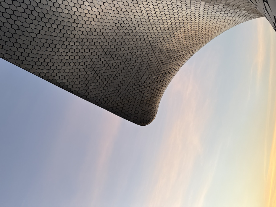 An abstract view shows a section of a building with a hexagonal grid pattern against a sky backdrop. The building’s surface curves, creating a sense of depth and dimension. The sky transitions in color from a soft blue to a warm, golden hue, suggesting either sunrise or sunset. The angle of the shot emphasizes the building’s architectural design and the natural beauty of the sky.