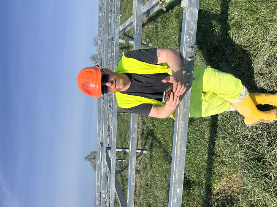A male individual is depicted outdoors in Ballinvalley Lower, Ireland, on a sunny day. He is standing, leaning his forearms on a horizontal galvanized metal support beam, part of an array of similar structures consistent with a solar farm under construction. He is dressed in an orange hard hat, dark sunglasses, a black short-sleeved t-shirt, a high-visibility yellow vest, and high-visibility yellow work trousers. He wears yellow work boots, which are visibly soiled with mud. His left leg is crossed over his right at the ankle. He holds a silver-colored smartphone with both hands, appearing to interact with it. A tattoo is visible on his right bicep. The ground is covered in green grass. In the distant background, under a clear blue sky, a bare deciduous tree is visible.
