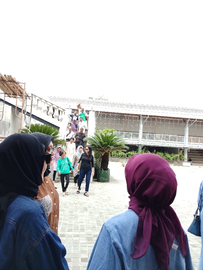 The scene depicts an outdoor area of a building complex in Ngadirejo, Indonesia, under an overcast sky. In the immediate foreground, the left profile of a woman wearing a black hijab, sunglasses, a brown top, and a blue denim jacket is visible, facing towards the midground. To her right, a second woman is viewed from behind, wearing a deep maroon hijab over a blue denim shirt, with a blue shoulder bag partially visible on her right side. A prominent concrete staircase with dark risers and light treads occupies the midground. A group of approximately 10-15 individuals, predominantly women and including a child, are descending the stairs. A woman in a black long-sleeved shirt, dark jeans, and sandals, carrying a light-colored shoulder bag, leads this group, accompanied by a young girl in a bright green long-sleeved shirt and dark pants. Higher on the staircase, a smaller group of 5-7 individuals, mostly men, are ascending; one figure near the top is seen with an arm raised. Architectural elements include a partial structure on the far left with wooden scaffolding-like beams and white, downward-facing light fixtures. In the background, a modern building with multiple large, grid-patterned windows and a light-colored roof is visible. Green planters are situated along the building's facade below the windows. Two large potted palm-like plants with green foliage are positioned in dark green containers at the base of the staircase. The ground in the foreground is paved with light-colored interlocking pavers.