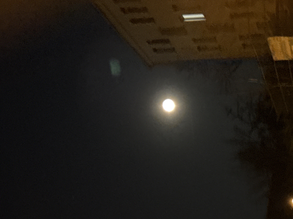 This nighttime photograph depicts an urban scene in Riesa, Germany. The dark, hazy sky is dominated by a bright, circular moon, appearing full or near-full, situated slightly left of the image's vertical center. A faint, rectangular greenish light artifact is visible in the upper right sky. To the right, a multi-story building with a light-colored facade occupies a significant portion of the frame. Multiple dark, arched windows are present on the building's upper levels, while one rectangular window on an upper floor displays a strong vertical white light from an interior source. The silhouettes of bare tree branches are visible beneath the moon, extending into the lower-middle and lower-right. The extreme lower portion of the image is dark, revealing faint artificial light sources and dark wires traversing horizontally. No individuals, explicit actions, or interactions are present.