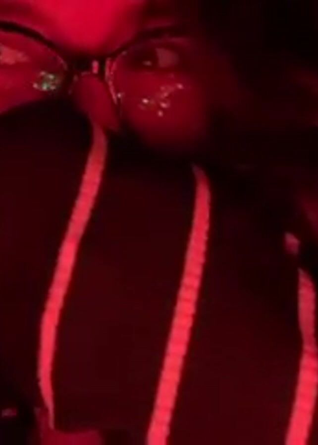 A close-up, low-angle shot shows a person wearing glasses and a striped sweater, with their face partly obscured. The person is lit by a strong red light, casting the scene in a dark, almost claustrophobic tone. Small, green glitter-like specks are visible around the person's eyes and on the glasses. The person's expression is not clear. The background is obscured by darkness. There is also music playing.
