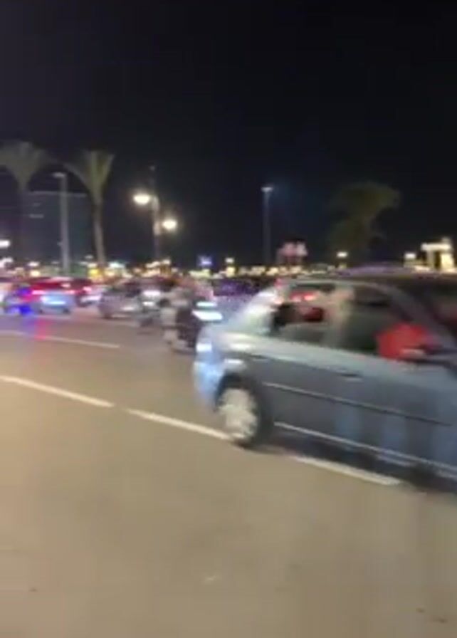 At night, a road is filled with cars and a large number of motorbikes. Some of the motorbikes are adorned with neon lighting. The road is lined with palm trees and street lights. In the distance, a tall building is visible. Some of the motorbikes have two riders.