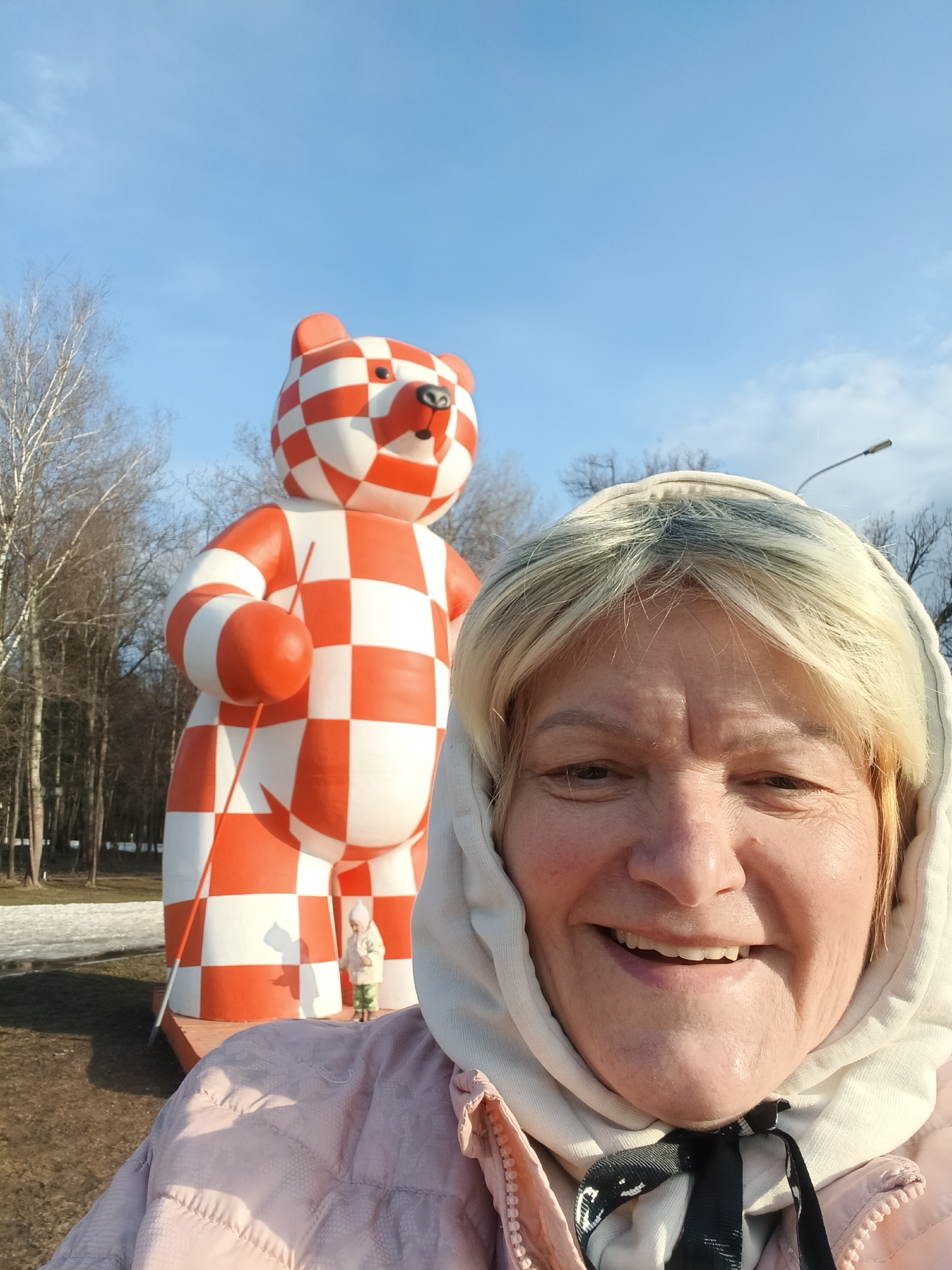 An outdoor scene in Odintsovo, Russia, depicts an adult female positioned in a close-up selfie in the foreground. She has blonde hair, is smiling broadly, and wears a light-colored hooded top beneath a light pink quilted jacket. Behind her stands a large, stylized bear statue, entirely covered in a red and white checkered pattern. The bear figure holds a red sphere on a stick in its proper left hand. A small child, wearing light-colored outerwear, stands near the base of the bear statue. The background features a stand of bare deciduous trees and patches of snow on brown earth, under a clear blue sky. A streetlamp is partially visible in the upper right quadrant of the image.
