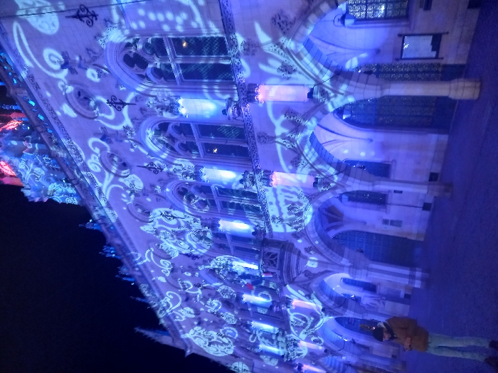 A building facade is bathed in blue light, adorned with projected patterns. Multiple windows are visible on its illuminated surface. Arches and columns are also noticeable, contributing to the architectural details. At the bottom, a person is seen, adding scale to the scene. The overall impression is one of a festive, perhaps holiday, display.