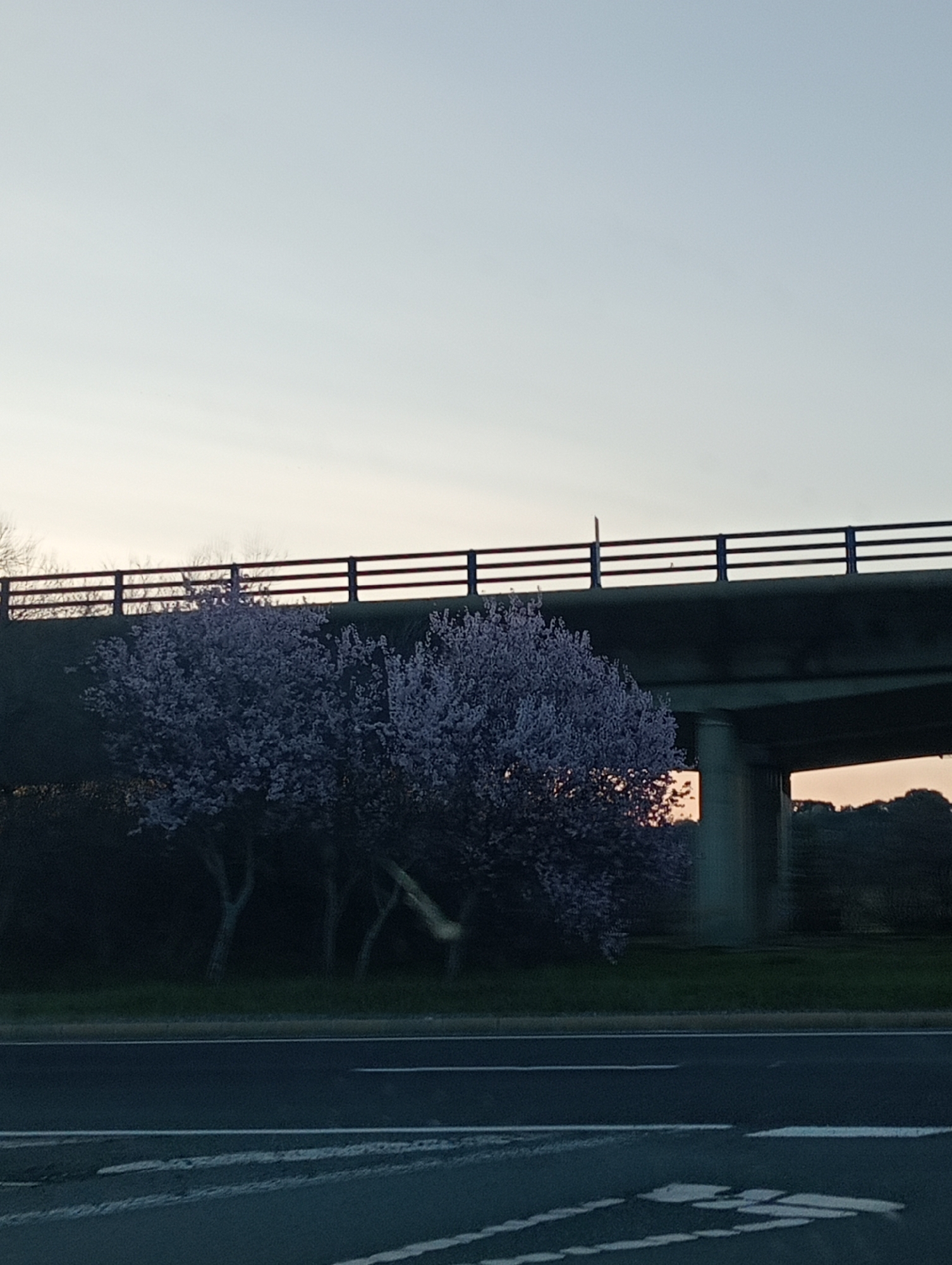 The image displays an outdoor scene in Ávila, Spain, captured during either dawn or dusk, characterized by soft, ambient light and a pale, gradient sky transitioning from light blue at the top to a very light, warm hue near the horizon. In the foreground, a dark asphalt road surface occupies the lower portion of the frame, marked with a clear double solid white line running horizontally, and faded, broken white lines suggesting a crosswalk or junction area further forward. The midground features a dense cluster of multiple deciduous trees in full bloom, covered profusely with small, light purple or pink blossoms. These trees are positioned on a dark green, grassy verge that slopes upwards slightly behind them. Dominating the background is a concrete overpass or bridge structure. The upper deck of the bridge is visible, featuring a dark metal railing composed of multiple horizontal bars, supported by dark blue/black posts. A faint, slender, dark vertical object or silhouette is visible on the railing near the center. The underside of the bridge reveals a concrete support pillar on the right. Through the archway formed by the bridge structure, a sliver of the horizon is visible, glowing with an orange-pink tint, with dark silhouettes of distant trees against the light. No individuals or active vehicles are present in the scene.