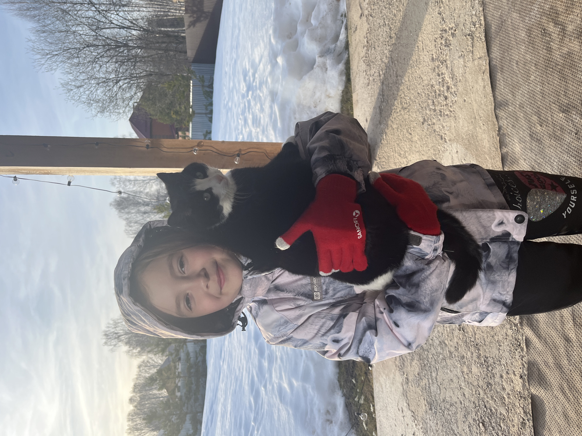 A young girl, estimated 7-10 years old, stands outdoors in Новая Чернушка, Russia, holding a black and white cat. She wears a hooded grey and white patterned winter jacket, black pants, and red gloves, one marked "SANOFI." The girl smiles faintly towards the viewer while supporting the cat, which looks to its right. They are on a light-colored, textured ground, adjacent to a vertical wooden post strung with clear globe lights. The environment behind them consists of a snow-covered expanse with patches of exposed ground, transitioning to bare deciduous trees and evergreen shrubs. Two fences, one light-colored metal and one dark, are visible. A reddish-brown house roof is discernible in the distance under a bright, partly cloudy sky, characteristic of a sunny winter or early spring day.