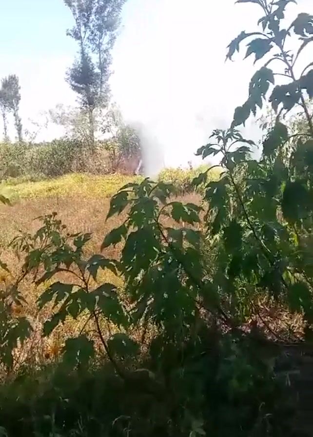 field with smoke billowing up in the distance. The foreground is filled with green bushes. The field is mostly dry, brown grass with some green patches. Several trees are scattered in the background, and the sky is bright and clear. The source of the smoke is not clearly visible but seems to be within the field.