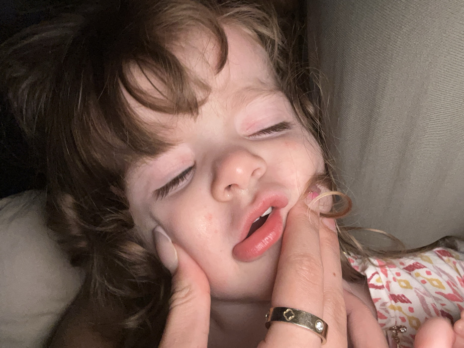 The image depicts a close-up of a sleeping young child whose left cheek is gently held by an adult's manicured hand. This scene occurs indoors, likely within a residence in Schiltigheim, France. The child, identifiable by their small features and medium brown, curly hair, is lying on their right side with eyes closed and mouth slightly ajar, revealing the lower teeth and pink lips. Several small, reddish spots are visible on the child's left cheek. A light-colored top with a patterned design, possibly white with orange and brown elements, is worn by the child, along with a delicate necklace chain. The adult's hand, exhibiting neatly manicured nails with light polish, has a gold-colored ring on the ring finger. This ring features several four-leaf clover-like motifs, each containing a small, clear stone. The child's head rests on a soft, olive-green fabric surface, presumably a pillow or cushion. The lighting is subdued, suggesting an intimate, quiet environment.