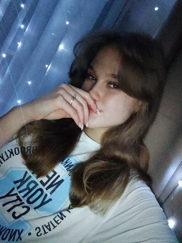 A young woman with light skin and long, wavy brown hair rests against a neutral-toned surface. She wears a white T-shirt with "New York City Brooklyn" printed in black and light blue. Her hand is near her mouth, adorned with silver rings. String lights create a soft, dreamy background. She looks directly at the viewer with a relaxed expression.