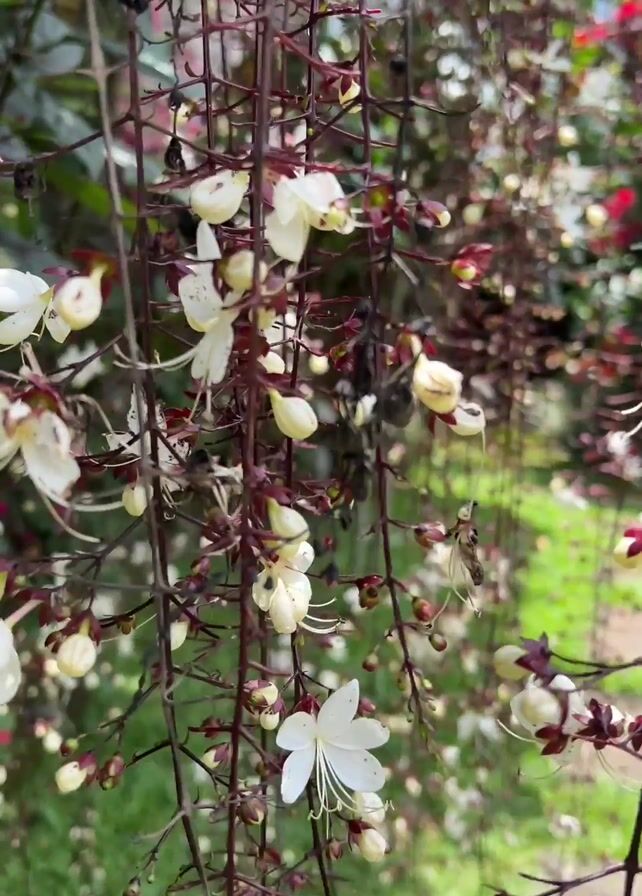 close-up of a plant with thin, dark brown stems and white flowers with five petals. The plant also has small, round buds that are light yellow or cream-colored. The flowers and buds are hanging downwards from the stems. In the background, there is greenery, including grass and other plants with red flowers. The camera is relatively still, providing a clear view of the plant. The water sounds suggest the plant may be located near a water feature or it may be raining lightly.