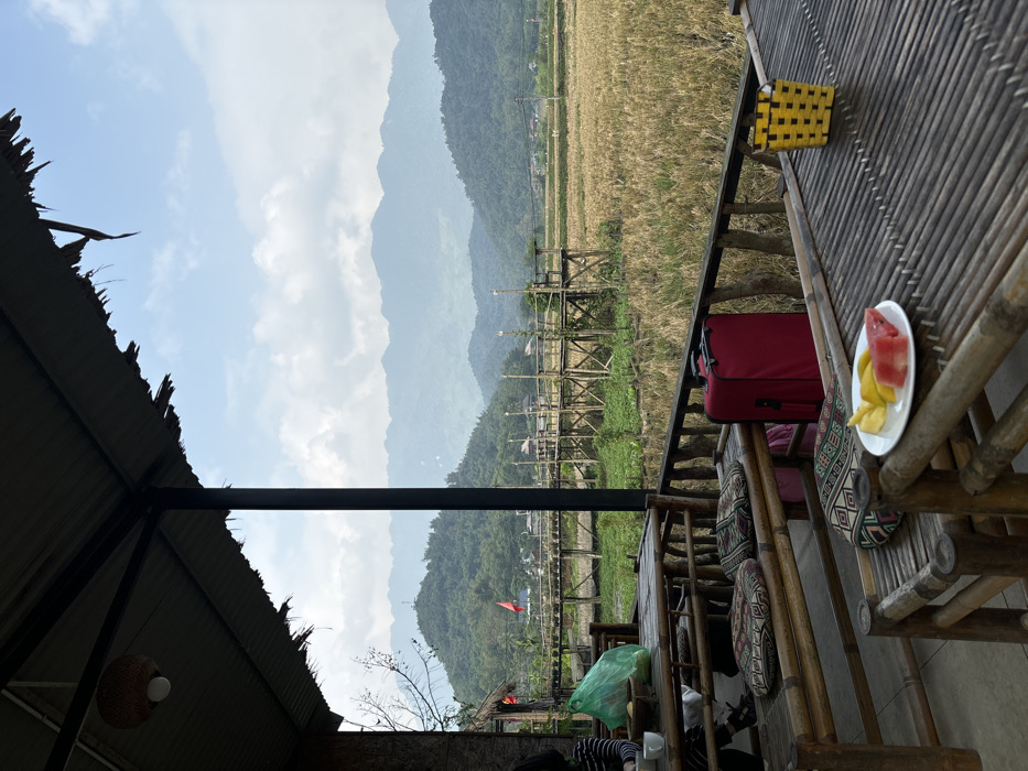 From a shaded porch, mountains stretch into the distance under a cloudy sky. Rice paddies and bamboo structures fill the middle ground. On the porch, a bamboo table holds a plate of fruit, a red suitcase, and a yellow checkered box. Below, there's a green plastic bag and some clothes. A bamboo roof and support beam frame the view.
