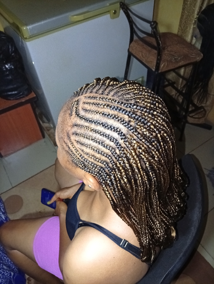 - "An overhead shot shows a woman with intricate, zigzagging cornrow braids that transition from dark roots to blonde tips" by FM-t5zcv2, licensed under CC BY 4.0