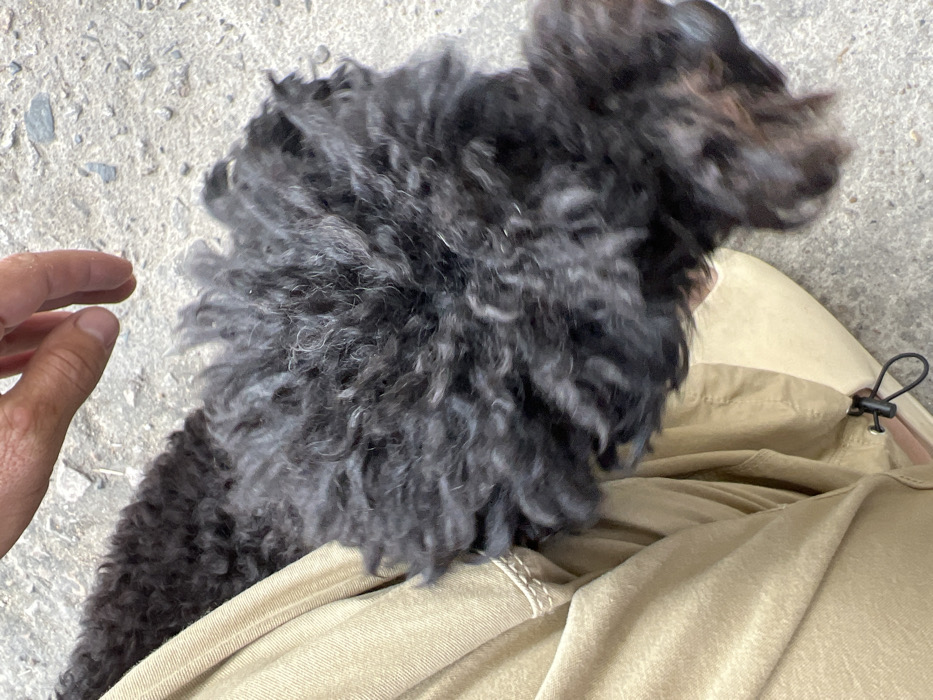 A fluffy black dog with curly fur rests on a person's lap, partially obscuring their khaki-colored pants. A hand reaches towards the dog from the left. The background is a concrete surface, suggesting an outdoor setting. The dog's fur is dense and textured. A drawstring toggle is visible on the pants.
