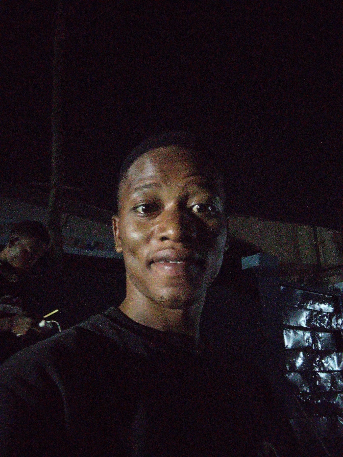 The image depicts a dimly lit scene set in Ogbomosho, Nigeria. In the foreground, a male individual is centrally positioned, facing the camera directly with a slight smile that reveals his teeth. He wears a dark, short-sleeved top and has a short haircut. His face and upper torso are brightly illuminated by a direct light source, contrasting with the surrounding darkness. To the left in the background, another individual is partially visible and heavily shadowed, looking away from the camera; a light-colored object is discernible near their ear. On the right side of the background, a vertical stack of dark, rectangular objects with reflective surfaces is visible. The overall environment is characterized by low light and a grainy photographic quality.