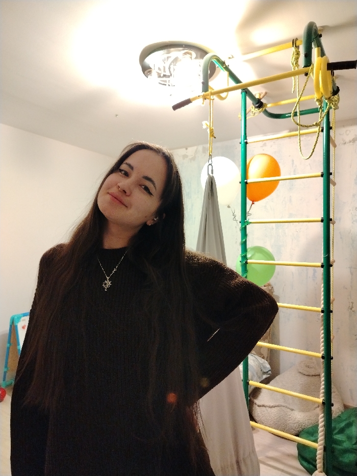 This image depicts an indoor scene. The specific city of Noviy, Russia, cannot be confirmed from the visual content. A young adult female is positioned centrally, facing the camera with a slight smile and tilted head. She has long, dark hair, dark eyes, and is wearing a dark, possibly brown, knitted sweater. A silver-colored necklace with a star-shaped pendant is visible around her neck. Her left hand is partially visible, resting on her hip. The background features a room with light-colored walls. To the right of the female, a green and yellow Swedish wall (climbing frame) is installed against a wall with textured or partially unfinished plaster. Attached to the Swedish wall are a grey fabric swing or hammock, a white balloon, an orange balloon, and a green balloon. A coiled rope and yellow gymnastic rings are also visible on the frame. On the floor near the base of the Swedish wall, a light-colored, fluffy item, possibly a rug or beanbag, and a green fabric object are present. To the far left, a blue and red child's drawing easel is partially visible. A bright, modern-style ceiling light fixture illuminates the scene from above.