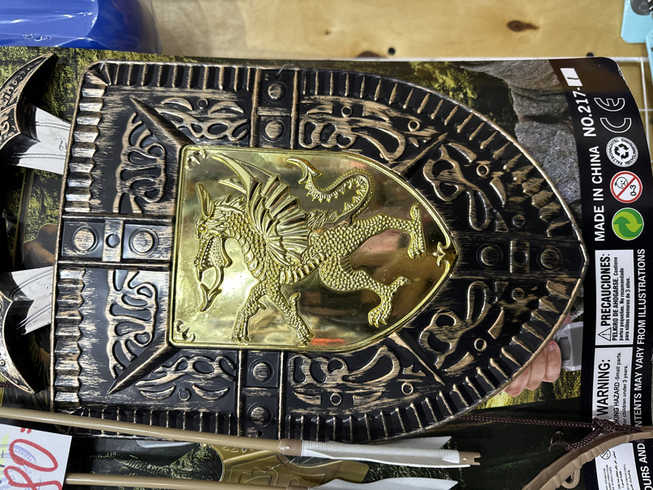 A toy shield with a gold dragon emblem in the center is shown