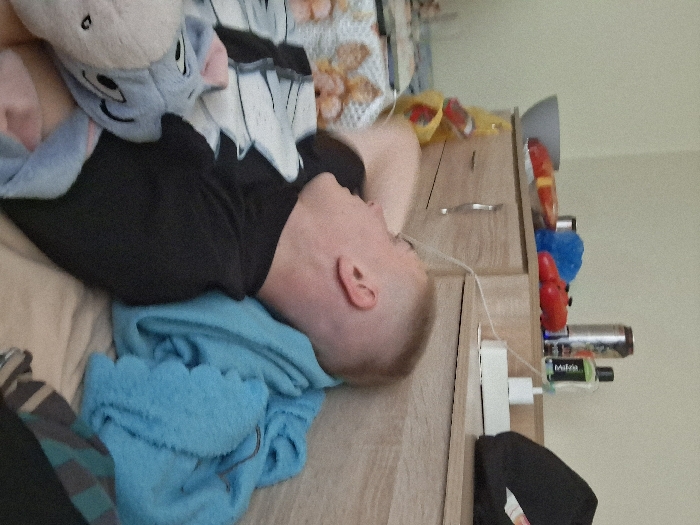An interior scene in the city of Svilengrad, Bulgaria, depicts a male individual with a short buzz cut hairstyle, lying on a bed. He is positioned on his right side, facing left, with his eyes closed. He wears a black t-shirt. A light blue crumpled towel is positioned near his head. Adjacent to him on the bed is a light blue and white plush toy with visible facial features. The bed is covered with light-colored bedding, and a patterned blanket with orange and brown elements is visible on the left. In the lower right foreground, a piece of striped fabric with blue, black, and grey colors rests on the bed. A light wood-toned bedside table or dresser is situated to the individual's right. On its surface, from left to right, are a grey bowl, a red controller, a blue object, various packaged items, a silver beverage can, a small green bottle, a white power strip with an attached white cable, and a partially visible black bag on the far right. The background wall is a plain light yellow.