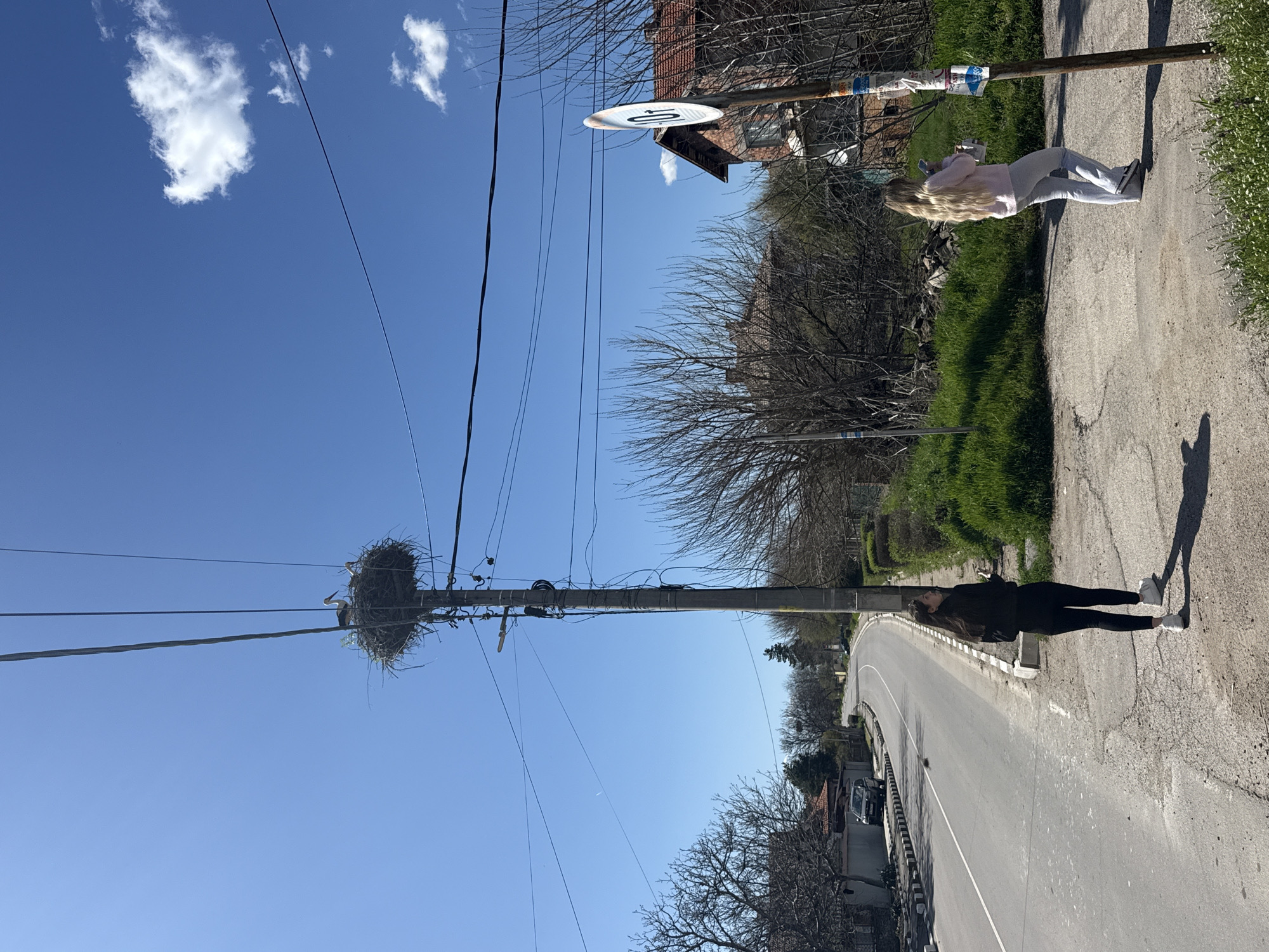 street scene in the city of Dobrich, Bulgaria. Two women are walking on the sidewalk along a paved road. One woman is wearing a light pink sweatshirt and light gray pants, while the other is wearing dark clothes. Overhead power lines run above the road. Perched atop a power pole, a large bird nest is visible. A road sign is attached to a pole near a building. The sky is blue with scattered white clouds.