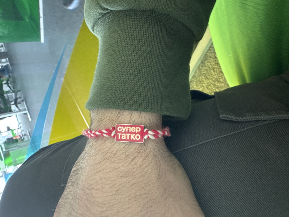 The image presents a close-up of an individual's left arm, positioned in an indoor setting. The arm is adorned with a braided red and white bracelet, identified as a martenitsa, featuring a rectangular red charm inscribed with the white Cyrillic text "СУПЕР ТАТКО" (SUPER DAD). The person wears a dark green long-sleeved top with a ribbed cuff on the left arm, dark trousers partially visible on the left, and a bright green garment on the lower right. The background is out of focus, revealing what appears to be an office or commercial space in Sofia, Bulgaria, characterized by a light-colored floor, blurred reflections, and indistinct shapes of office furniture and possibly other individuals. A prominent reflection in the background displays a distinct blue and yellow pattern on a surface, reminiscent of the Ukrainian flag's colors, suggesting a decorative element within the environment.