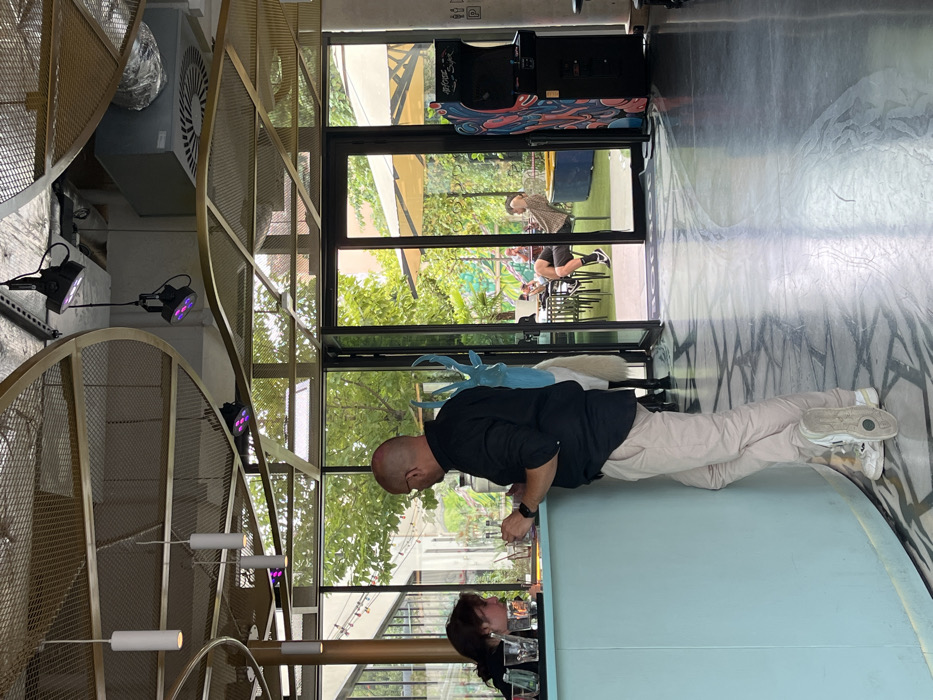 This image captures the interior of a commercial establishment, likely a bar or restaurant, located in Gentilly, France, with an open view to an exterior patio area. In the foreground, a bald male individual, wearing a dark short-sleeved shirt and light-colored trousers, stands leaning against a light-blue curved bar counter. He is facing to the right, with his left foot crossed over his right, while a female individual with dark hair is partially visible to his left, facing the counter. Several clear glasses are on the bar surface. Behind the male, near the open glass doors, a light-blue, horned animal sculpture with a white, furry lower section is positioned. The interior ceiling features an elaborate design of gold-colored metal mesh forming concentric rings, with multiple white cylindrical pendant lights and black track lights emitting purple light. Exposed ductwork is visible above. The floor is dark with lighter, abstract patterns. Through the open glass doors, which are hinged and appear to be bifold, an outdoor patio area is visible. The patio features green artificial turf, black tables, and chairs. One male individual is seated in a chair, leaning back with his hands behind his head. A large, light-colored patio umbrella provides shade, and a blue cylindrical object is present on the patio floor. Lush green foliage and trees line the background, along with a colorful mural. To the immediate right of the doorway, inside the establishment, a black arcade game machine with vibrant red, blue, and white graphics is positioned vertically. A concrete pillar on the far right displays white restroom pictograms.