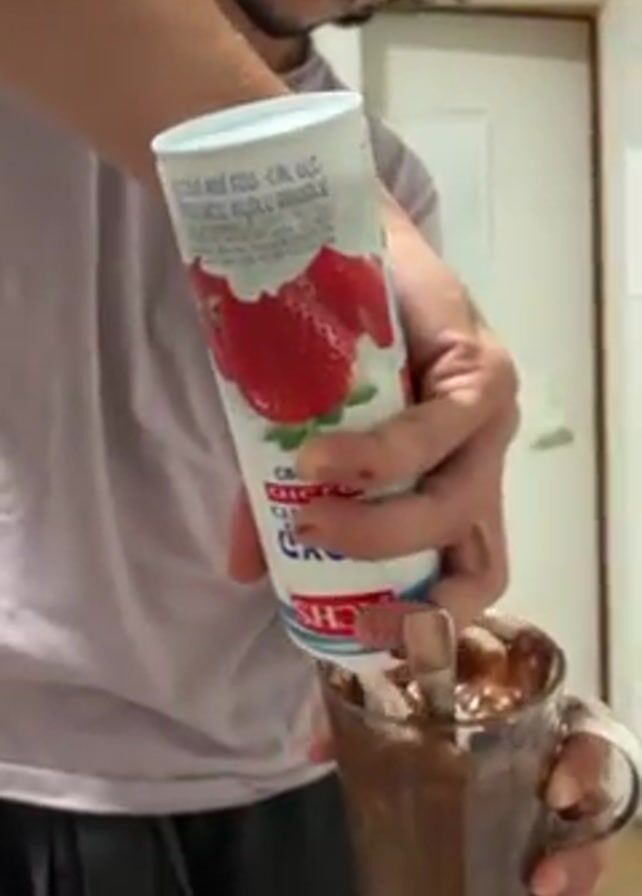 A young man stands in front of a partially-open white door while adding whipped cream from a can to a clear glass mug filled with chocolate pudding. He’s wearing a light purple shirt and dark pants, and his mustache is visible. The whipped cream can features a picture of strawberries. A spoon is in the pudding.