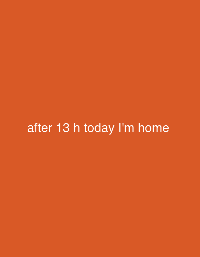 The image displays a solid, uniform orange background. Centered horizontally in the lower third of the frame is white text that reads: "after 13 h today I'm home". No individuals, discernible objects, or environmental features are present beyond the text and the monochromatic background. There is no visual information within the image to indicate a specific location, including the city of Dolna Mitropolia, Bulgaria.