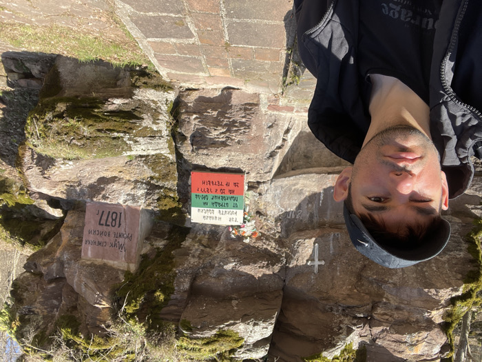 The image presents a male subject taking a selfie outdoors at a historical memorial site in Lesidren, Bulgaria. The man, positioned in the left foreground, is an adult with short dark hair, wearing a dark baseball cap, a black zippered jacket, and a black t-shirt with a white graphic. He looks directly at the camera with a neutral expression, his left eye partially closed, likely due to sunlight. The background features a natural, rugged rock formation, varying in color from brown to grey, extensively covered with patches of green moss and some dry vegetation. Embedded within this rock face are two commemorative plaques and a white metallic cross. The plaque on the right is a reddish-brown stone slab, rectangular in shape, inscribed in Cyrillic with "Мук. стиенка руските войски 1877г." The plaque on the left is a white rectangular sign displaying the colors of the Bulgarian flag (white, green, red) at its lower edge. Its Cyrillic inscription reads: "Тук минаха руските войски от отряд полковник Орлов на 20.12.1877г. на гр. Тетевен." (Translated: "Here passed the Russian troops from the detachment of Colonel Orlov on 20.12.1877 to the town of Teteven."). A small, artificial floral arrangement is placed next to this left plaque. Above and slightly to the left of the left plaque, a small white metal cross is affixed to the rock. The ground directly in front of the rock face consists of reddish-brown paving stones, which transition into natural earth and sparse dry grass on the right side of the frame. The scene is illuminated by bright sunlight, casting distinct shadows. Hints of a deciduous forest are visible in the far background.