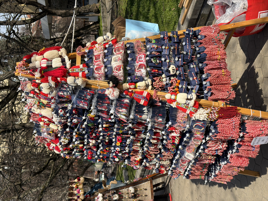 A large, A-frame wooden display stand is positioned outdoors in a park or pedestrian area in Sofia, Bulgaria, under clear, sunny conditions. The stand is densely covered with hundreds of traditional Bulgarian martenitsas, primarily composed of red and white yarn. These items display various designs, including small human-like figures (Pizho and Penda dolls), decorative tassels, pom-poms, bracelets, and novelty figures such as a panda. Many martenitsas are individually sealed in clear plastic packaging affixed to dark blue backing cards, hung from small hooks on the display. The immediate foreground shows a paved surface of grey pavers. In the background, a grassy area features numerous bare-branched deciduous trees, suggesting early spring. A multi-story building with a light-colored facade is partially visible through the trees. To the left, a section of another vendor's stall, displaying different woven items, is present. A lone individual, indistinct and seated on a low wall or bench, is visible in the far left background. In the right foreground, a light blue plastic bag and a brown paper bag rest on the grass, adjacent to a red plastic container.