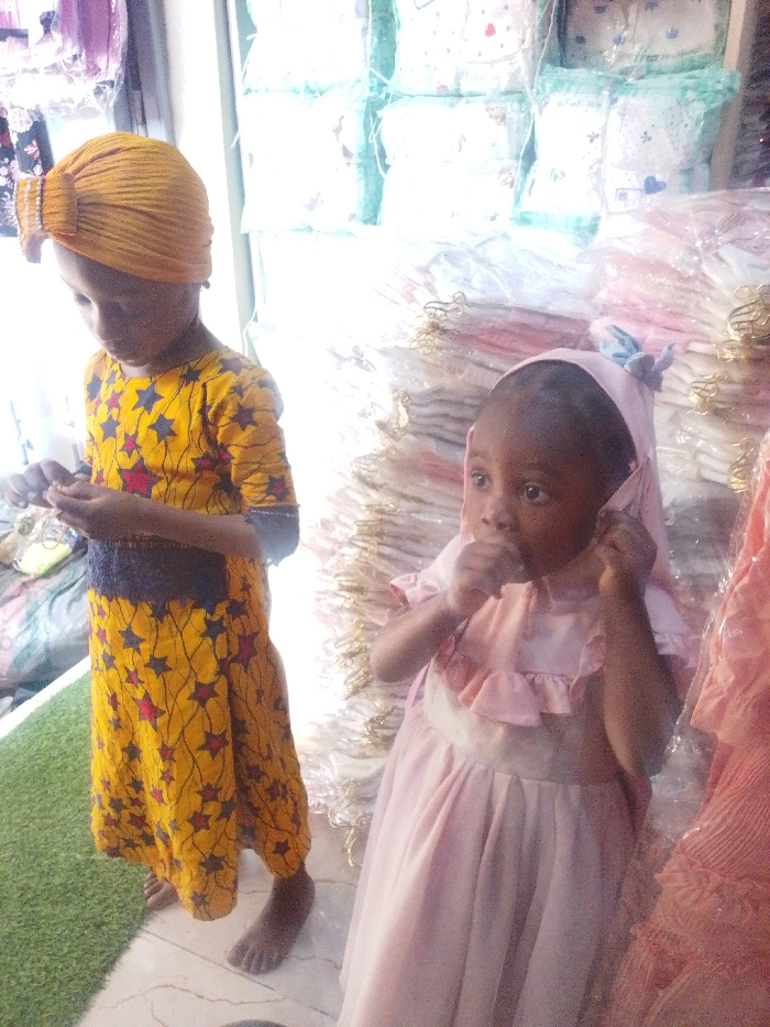This image depicts an indoor commercial space, likely a retail shop for textiles or baby products, located in Fagge D1, Nigeria