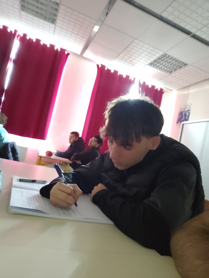 The image depicts an indoor classroom or educational facility located in Schiltigheim, France. In the foreground, an individual with dark hair, wearing a dark puffer jacket, is seated at a light-colored desk, actively writing in an open notebook with a blue pen. A dark marker pen rests on the notebook. In the midground, three other individuals are visible. One person, partially obscured, wears a light blue top. Further back, two males are seated: one with a beard wearing a dark jacket, and another wearing glasses and a dark top. A red spherical object is present on a midground desk. The environment features white walls, a white grid-patterned ceiling with integrated lighting fixtures, and large windows on the left covered by dark red curtains, through which bright sunlight is entering. A white cabinet with horizontal slatted doors and a poster are visible on the right wall.