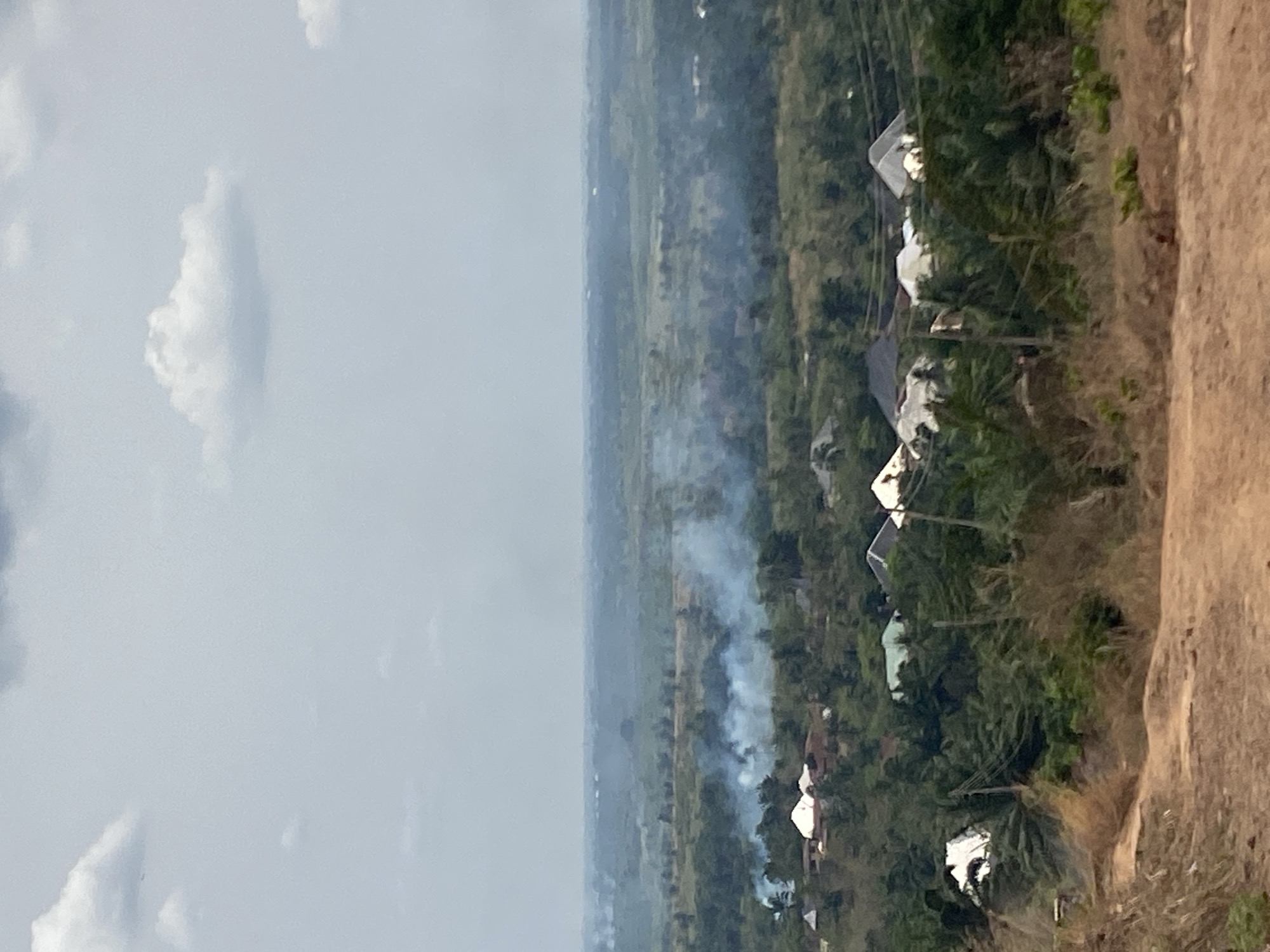 The image presents an elevated, panoramic view of a semi-urban/rural landscape in Achara, Nigeria, under a light gray, overcast sky with scattered white clouds. The foreground consists of reddish-brown dirt terrain with sparse, dry vegetation, indicating a pathway or cleared hillside. The midground features dense green foliage, including numerous trees, some resembling palm trees, interspersed with scattered residential structures. These buildings are identifiable by their light-colored, predominantly white, gray, or pale green sloped roofs, partially obscured by the surrounding vegetation. Utility poles with overhead lines are visible among the trees. In the mid-distance, multiple distinct plumes of white and light gray smoke rise from various points within the verdant landscape, indicating active combustion at several locations. The background extends to a hazy horizon, revealing a vast, undifferentiated expanse of green landscape. No human or animal figures are discernible.