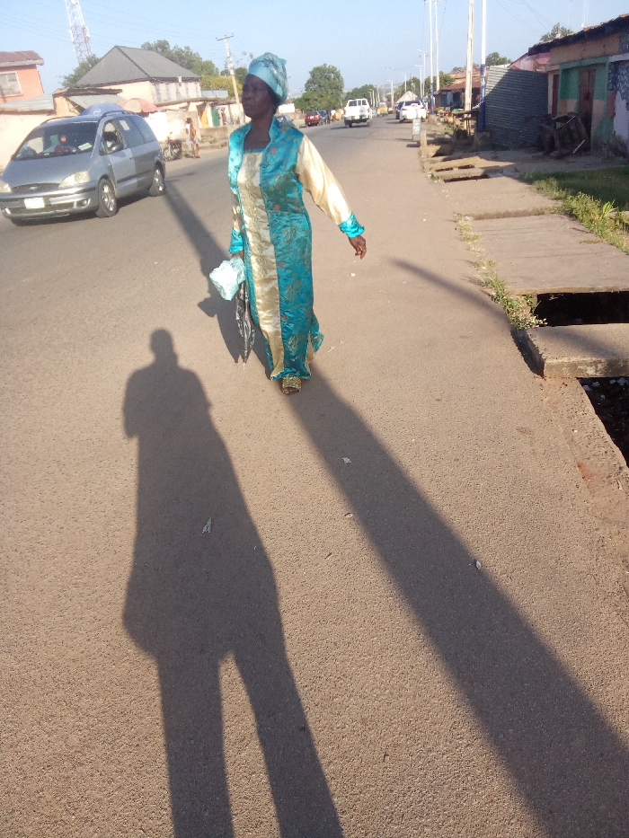 The image captures a woman walking on an asphalt road in Jos, Nigeria, under direct sunlight