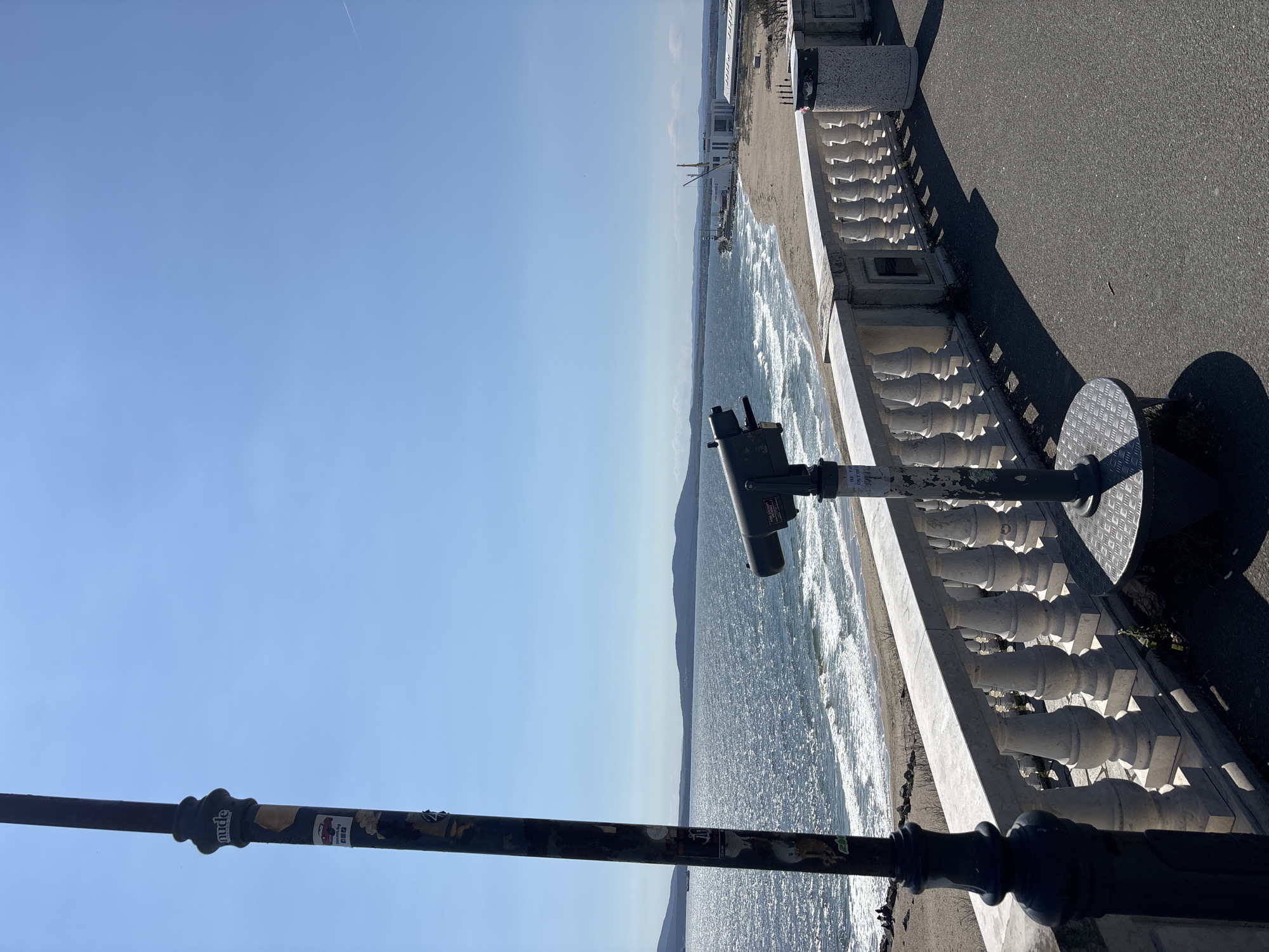 The image depicts a seaside scene in Burgas, Bulgaria. The perspective is from a high vantage point, possibly a promenade or elevated walkway, looking out towards the Black Sea. The sky is clear and blue. A fixed coin-operated telescope stands prominently in the foreground, mounted on a metal pole. The pole is covered in various stickers. A decorative concrete balustrade lines the edge of the walkway, separating it from the beach below. The Black Sea is visible in the middle ground, with waves breaking along the sandy shore. In the distance, a coastline with buildings and a beach can be discerned, indicating either a distant part of Burgas or a neighboring coastal town. The walkway is paved, and the shadows cast suggest a sunny day.