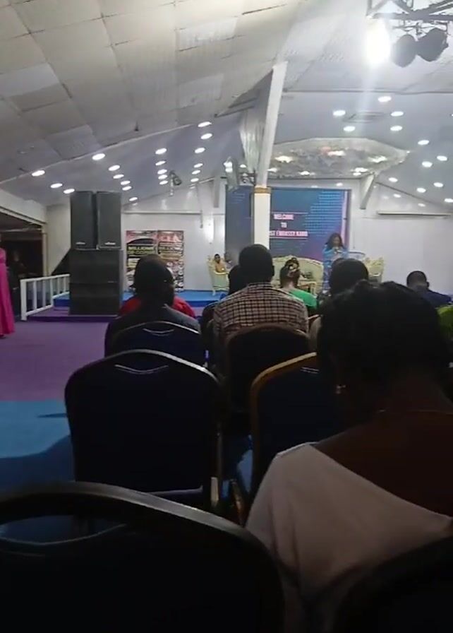 woman speaking at a podium in front of an audience. The setting appears to be a church or similar event space. The audience is seated and listening. The podium is clear plastic, and the speaker is using a microphone. A screen behind her reads "Welcome to Christ Embassy Kano". The woman is wearing a blue blazer and patterned dress. The room is well-lit with rows of overhead lights. Two speakers stand at the left of the shot. There are some people on stage behind the speaker.