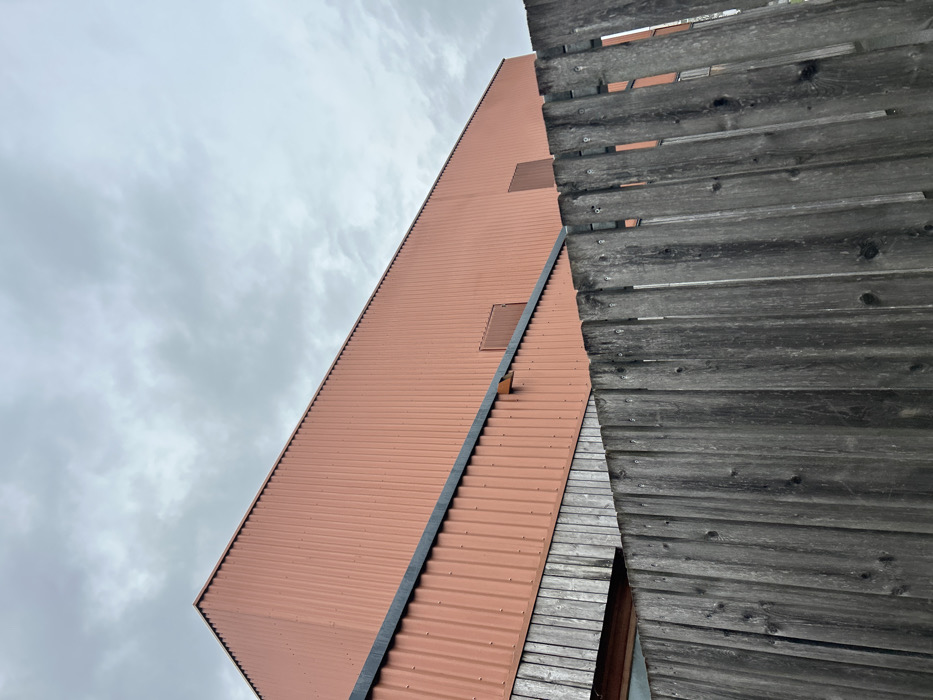 The scene, located in Strasbourg, France, captures an industrial-style building under an overcast sky, partially concealed by a weathered wooden fence. The building's upper facade features vertically corrugated, reddish-orange metal siding. A horizontal black trim band delineates this from a lower section of horizontal, light brown wooden paneling. Two rectangular vents or access panels are visible on the reddish-orange siding, one featuring a small, downward-pointing brown flap. The foreground is dominated by a dark gray, aged wooden plank fence, oriented vertically and exhibiting significant weathering and knots. The sky is uniformly light gray with dense cloud cover.