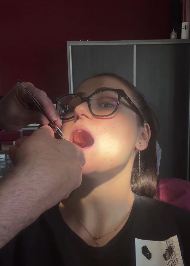 A fair-skinned woman with freckles and wearing glasses, a black t-shirt, and a gold necklace sits in a chair in a room and opens her mouth. A person wearing a black shirt, presumably a doctor, holds a pair of metal tweezers and a swab-like tool. The person in the black shirt uses the swab-like tool to swab the inside of the woman’s mouth. In the background, there is a cabinet and several bottles on a glass shelf.