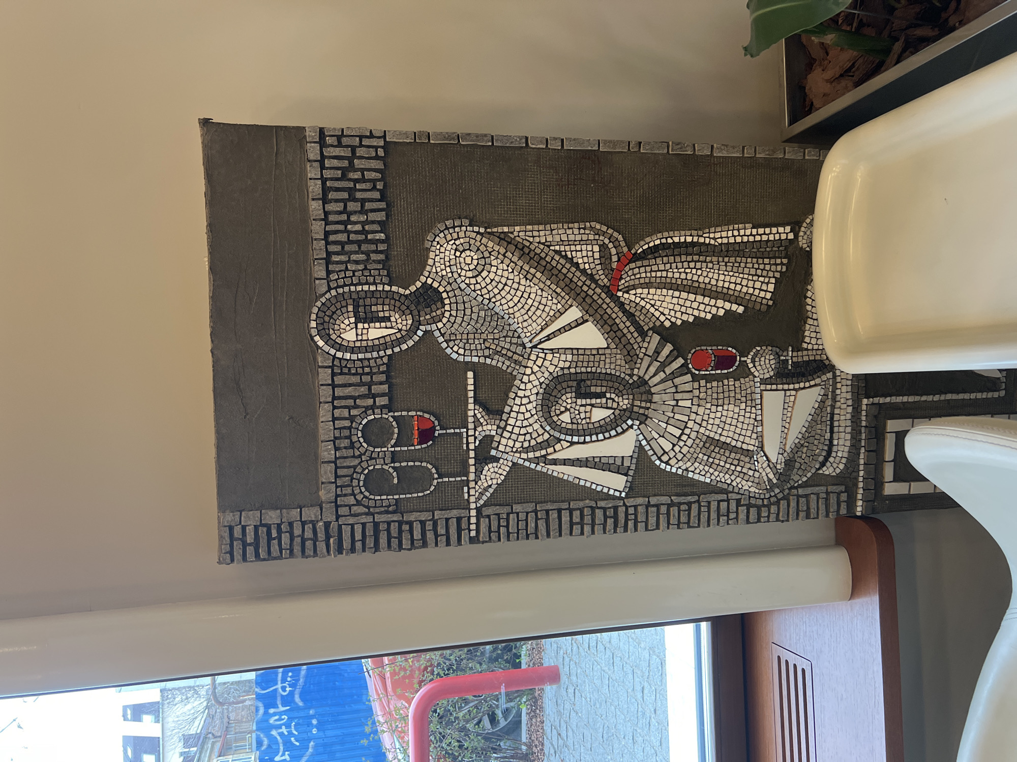A horizontally-oriented, eye-level medium shot captures a mosaic artwork affixed to a wall, likely within a building in Rostov-on-Don, Russia. The mosaic, predominantly gray and white, appears to depict a stylized abstract figure, possibly a worker or a symbolic representation of labor. Small, irregularly shaped tesserae compose the design, with occasional touches of red. The mosaic is mounted on a textured gray backing, framed with a border of small, rectangular blocks. The mosaic is situated near a window, offering a partial view of the outside world. Through the window, one can discern a blue building with graffiti, a red pipe, and sparse vegetation. A corner of a planter with green foliage is also visible, sitting atop the surface where the mosaic is mounted. Parts of two white chairs obscure the lower-right corner of the artwork, including the legs of the chair and the top portion of a second chair that overlaps. The interior has a modern aesthetic. A wooden trim is situated at the edge of the window.