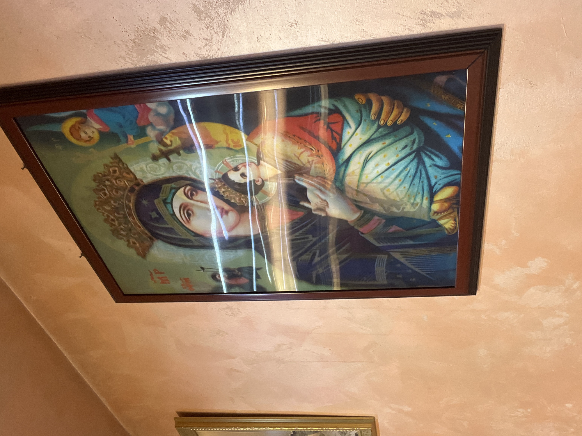 The image is a close-up, angled view of a framed painting of the Virgin Mary holding the Christ Child, hanging on a light pink textured wall